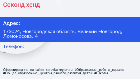Секонд-хенд по адресу 173024, Новгородская область, Великий Новгород, Ломоносова, 4 в дальнейшем Организация, размещена в следующих категориях: