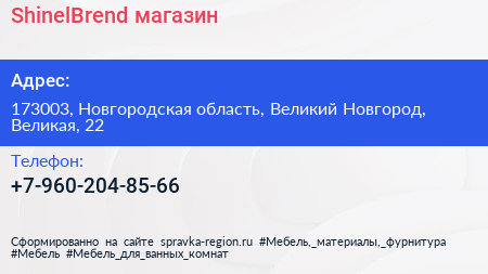 ShinelBrend, магазин по адресу 173003, Новгородская область, Великий Новгород, Великая, 22 в дальнейшем Организация, размещена в следующих категориях: