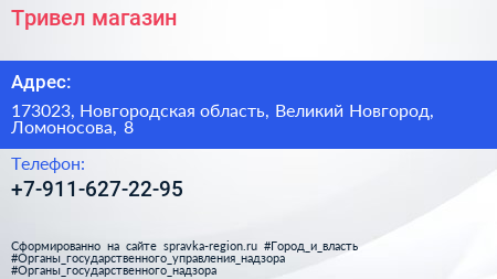 Тривел, магазин по адресу 173023, Новгородская область, Великий Новгород, Ломоносова, 8 в дальнейшем Организация, размещена в следующих категориях: