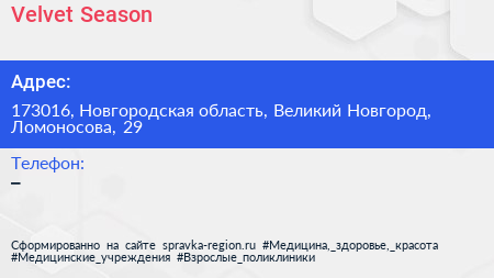 Velvet Season по адресу 173016, Новгородская область, Великий Новгород, Ломоносова, 29 в дальнейшем Организация, размещена в следующих категориях: