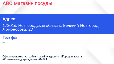 ABC, магазин посуды по адресу 173016, Новгородская область, Великий Новгород, Ломоносова, 29 в дальнейшем Организация, размещена в следующих категориях: