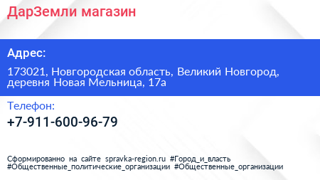 ДарЗемли, магазин по адресу 173021, Новгородская область, Великий Новгород, деревня Новая Мельница, 17а в дальнейшем Организация, размещена в следующих категориях: