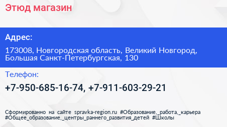 Этюд, магазин по адресу 173008, Новгородская область, Великий Новгород, Большая Санкт-Петербургская, 130 в дальнейшем Организация, размещена в следующих категориях: