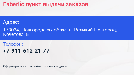 Faberlic, пункт выдачи заказов по адресу 173024, Новгородская область, Великий Новгород, Кочетова, 8 в дальнейшем Организация, размещена в следующих категориях:
