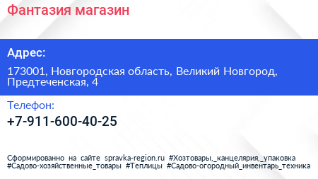 Фантазия, магазин по адресу 173001, Новгородская область, Великий Новгород, Предтеченская, 4 в дальнейшем Организация, размещена в следующих категориях: