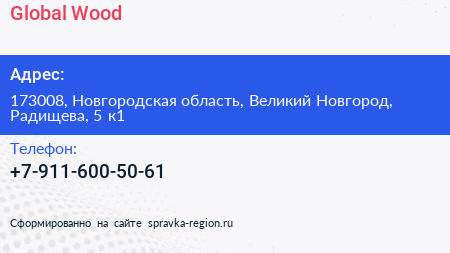 Global Wood по адресу 173008, Новгородская область, Великий Новгород, Радищева, 5 к1 в дальнейшем Организация, размещена в следующих категориях: