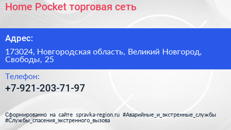 Home Pocket, торговая сеть по адресу 173024, Новгородская область, Великий Новгород, Свободы, 25 в дальнейшем Организация, размещена в следующих категориях: