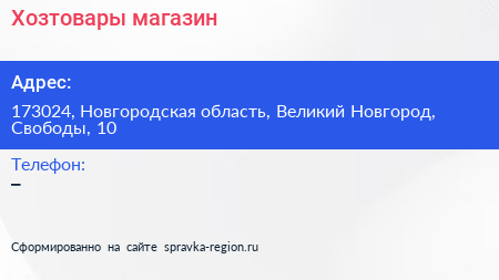 Хозтовары, магазин по адресу 173024, Новгородская область, Великий Новгород, Свободы, 10 в дальнейшем Организация, размещена в следующих категориях: