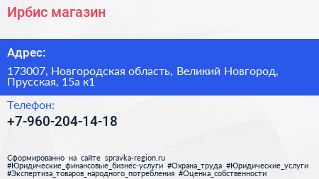 Ирбис, магазин по адресу 173007, Новгородская область, Великий Новгород, Прусская, 15а к1 в дальнейшем Организация, размещена в следующих категориях: