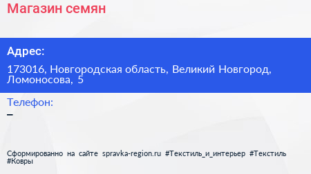 Магазин семян по адресу 173016, Новгородская область, Великий Новгород, Ломоносова, 5 в дальнейшем Организация, размещена в следующих категориях:
