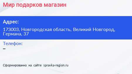 Мир подарков, магазин по адресу 173003, Новгородская область, Великий Новгород, Германа, 37 в дальнейшем Организация, размещена в следующих категориях: