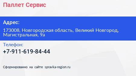 Паллет Сервис по адресу 173008, Новгородская область, Великий Новгород, Магистральная, 9а в дальнейшем Организация, размещена в следующих категориях: