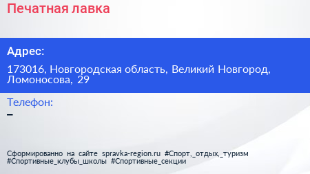 Печатная лавка по адресу 173016, Новгородская область, Великий Новгород, Ломоносова, 29 в дальнейшем Организация, размещена в следующих категориях: