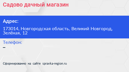 Садово-дачный магазин по адресу 173014, Новгородская область, Великий Новгород, Зелёная, 12 в дальнейшем Организация, размещена в следующих категориях: