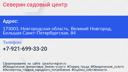 Северин, садовый центр по адресу 173003, Новгородская область, Великий Новгород, Большая Санкт-Петербургская, 84 в дальнейшем Организация, размещена в следующих категориях: