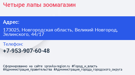 Четыре лапы, зоомагазин по адресу 173025, Новгородская область, Великий Новгород, Зелинского, 44/17 в дальнейшем Организация, размещена в следующих категориях: