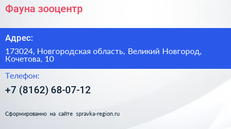 Фауна, зооцентр по адресу 173024, Новгородская область, Великий Новгород, Кочетова, 10 в дальнейшем Организация, размещена в следующих категориях: