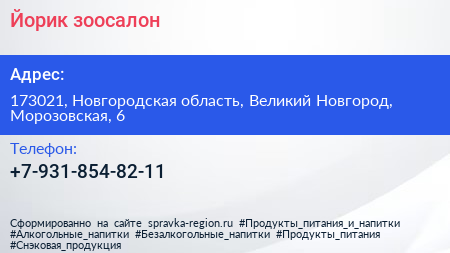 Йорик, зоосалон по адресу 173021, Новгородская область, Великий Новгород, Морозовская, 6 в дальнейшем Организация, размещена в следующих категориях: