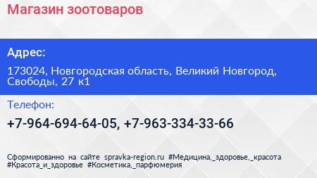 Магазин зоотоваров по адресу 173024, Новгородская область, Великий Новгород, Свободы, 27 к1 в дальнейшем Организация, размещена в следующих категориях: