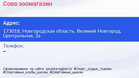 Сова, зоомагазин по адресу 173018, Новгородская область, Великий Новгород, Центральная, 3а в дальнейшем Организация, размещена в следующих категориях: