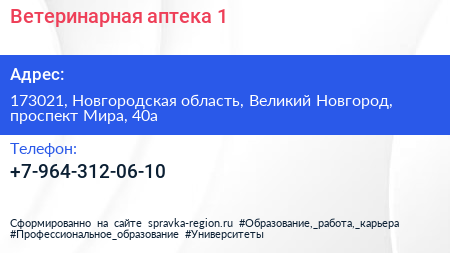 Ветеринарная аптека №1 по адресу 173021, Новгородская область, Великий Новгород, проспект Мира, 40а в дальнейшем Организация, размещена в следующих категориях: