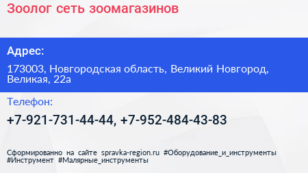 Зоолог, сеть зоомагазинов по адресу 173003, Новгородская область, Великий Новгород, Великая, 22а в дальнейшем Организация, размещена в следующих категориях: