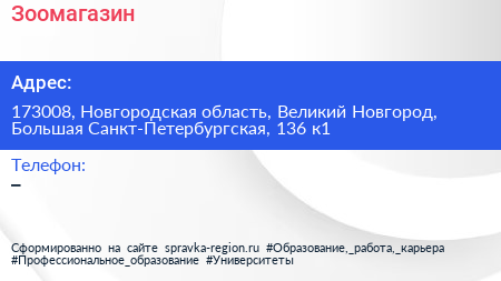 Зоомагазин по адресу 173008, Новгородская область, Великий Новгород, Большая Санкт-Петербургская, 136 к1 в дальнейшем Организация, размещена в следующих категориях: