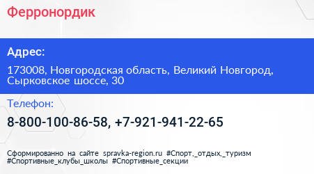 Ферронордик по адресу 173008, Новгородская область, Великий Новгород, Сырковское шоссе, 30 в дальнейшем Организация, размещена в следующих категориях: