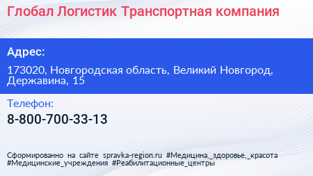 Глобал Логистик, Транспортная компания по адресу 173020, Новгородская область, Великий Новгород, Державина, 15 в дальнейшем Организация, размещена в следующих категориях: