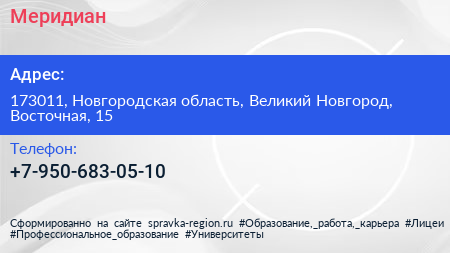 Меридиан по адресу 173011, Новгородская область, Великий Новгород, Восточная, 15 в дальнейшем Организация, размещена в следующих категориях:
