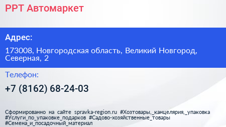 РРТ-Автомаркет по адресу 173008, Новгородская область, Великий Новгород, Северная, 2 в дальнейшем Организация, размещена в следующих категориях: