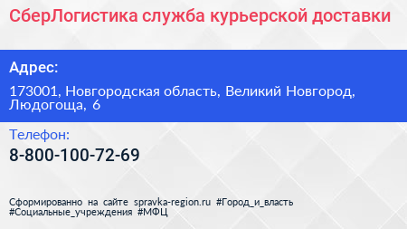 СберЛогистика, служба курьерской доставки по адресу 173001, Новгородская область, Великий Новгород, Людогоща, 6 в дальнейшем Организация, размещена в следующих категориях: