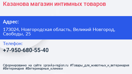 Казанова, магазин интимных товаров по адресу 173024, Новгородская область, Великий Новгород, Свободы, 25 в дальнейшем Организация, размещена в следующих категориях: