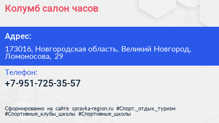 Колумб, салон часов по адресу 173016, Новгородская область, Великий Новгород, Ломоносова, 29 в дальнейшем Организация, размещена в следующих категориях: