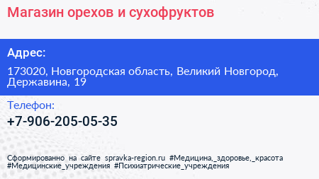 Магазин орехов и сухофруктов по адресу 173020, Новгородская область, Великий Новгород, Державина, 19 в дальнейшем Организация, размещена в следующих категориях: