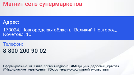 Магнит, сеть супермаркетов по адресу 173024, Новгородская область, Великий Новгород, Кочетова, 10 в дальнейшем Организация, размещена в следующих категориях: