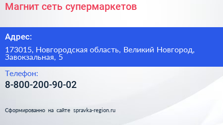 Магнит, сеть супермаркетов по адресу 173015, Новгородская область, Великий Новгород, Завокзальная, 5 в дальнейшем Организация, размещена в следующих категориях: