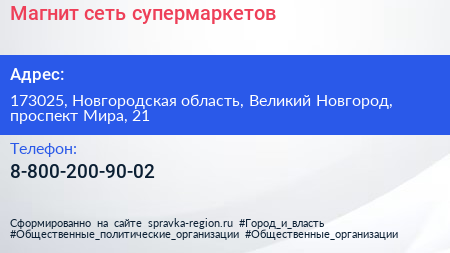 Магнит, сеть супермаркетов по адресу 173025, Новгородская область, Великий Новгород, проспект Мира, 21 в дальнейшем Организация, размещена в следующих категориях: