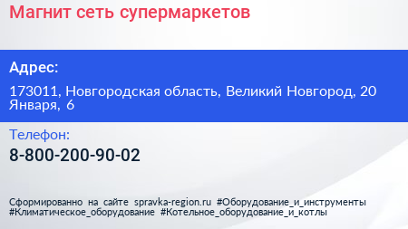 Магнит, сеть супермаркетов по адресу 173011, Новгородская область, Великий Новгород, 20 Января, 6 в дальнейшем Организация, размещена в следующих категориях: