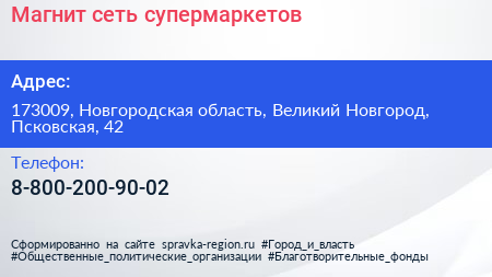 Магнит, сеть супермаркетов по адресу 173009, Новгородская область, Великий Новгород, Псковская, 42 в дальнейшем Организация, размещена в следующих категориях: