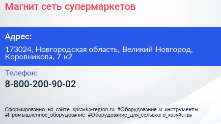 Магнит, сеть супермаркетов по адресу 173024, Новгородская область, Великий Новгород, Коровникова, 7 к2 в дальнейшем Организация, размещена в следующих категориях:
