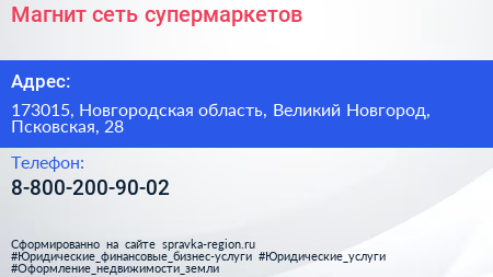 Магнит, сеть супермаркетов по адресу 173015, Новгородская область, Великий Новгород, Псковская, 28 в дальнейшем Организация, размещена в следующих категориях: