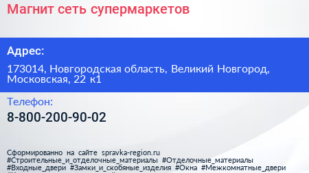 Магнит, сеть супермаркетов по адресу 173014, Новгородская область, Великий Новгород, Московская, 22 к1 в дальнейшем Организация, размещена в следующих категориях: