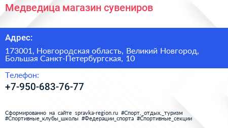 Медведица, магазин сувениров по адресу 173001, Новгородская область, Великий Новгород, Большая Санкт-Петербургская, 10 в дальнейшем Организация, размещена в следующих категориях: