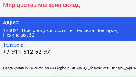 Мир цветов, магазин-склад по адресу 173021, Новгородская область, Великий Новгород, Нехинская, 52 в дальнейшем Организация, размещена в следующих категориях: