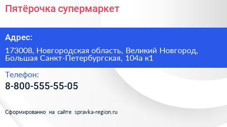 Пятёрочка, супермаркет по адресу 173008, Новгородская область, Великий Новгород, Большая Санкт-Петербургская, 104а к1 в дальнейшем Организация, размещена в следующих категориях:
