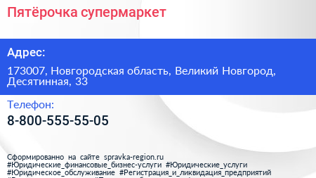 Пятёрочка, супермаркет по адресу 173007, Новгородская область, Великий Новгород, Десятинная, 33 в дальнейшем Организация, размещена в следующих категориях: