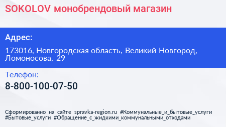 SOKOLOV, монобрендовый магазин по адресу 173016, Новгородская область, Великий Новгород, Ломоносова, 29 в дальнейшем Организация, размещена в следующих категориях: