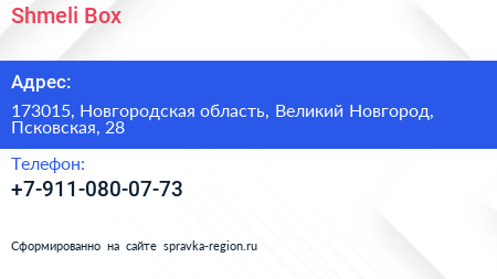 Shmeli Box по адресу 173015, Новгородская область, Великий Новгород, Псковская, 28 в дальнейшем Организация, размещена в следующих категориях:
