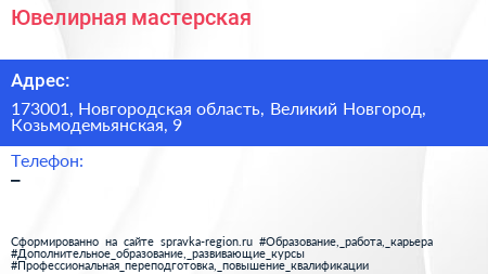 Ювелирная мастерская по адресу 173001, Новгородская область, Великий Новгород, Козьмодемьянская, 9 в дальнейшем Организация, размещена в следующих категориях: